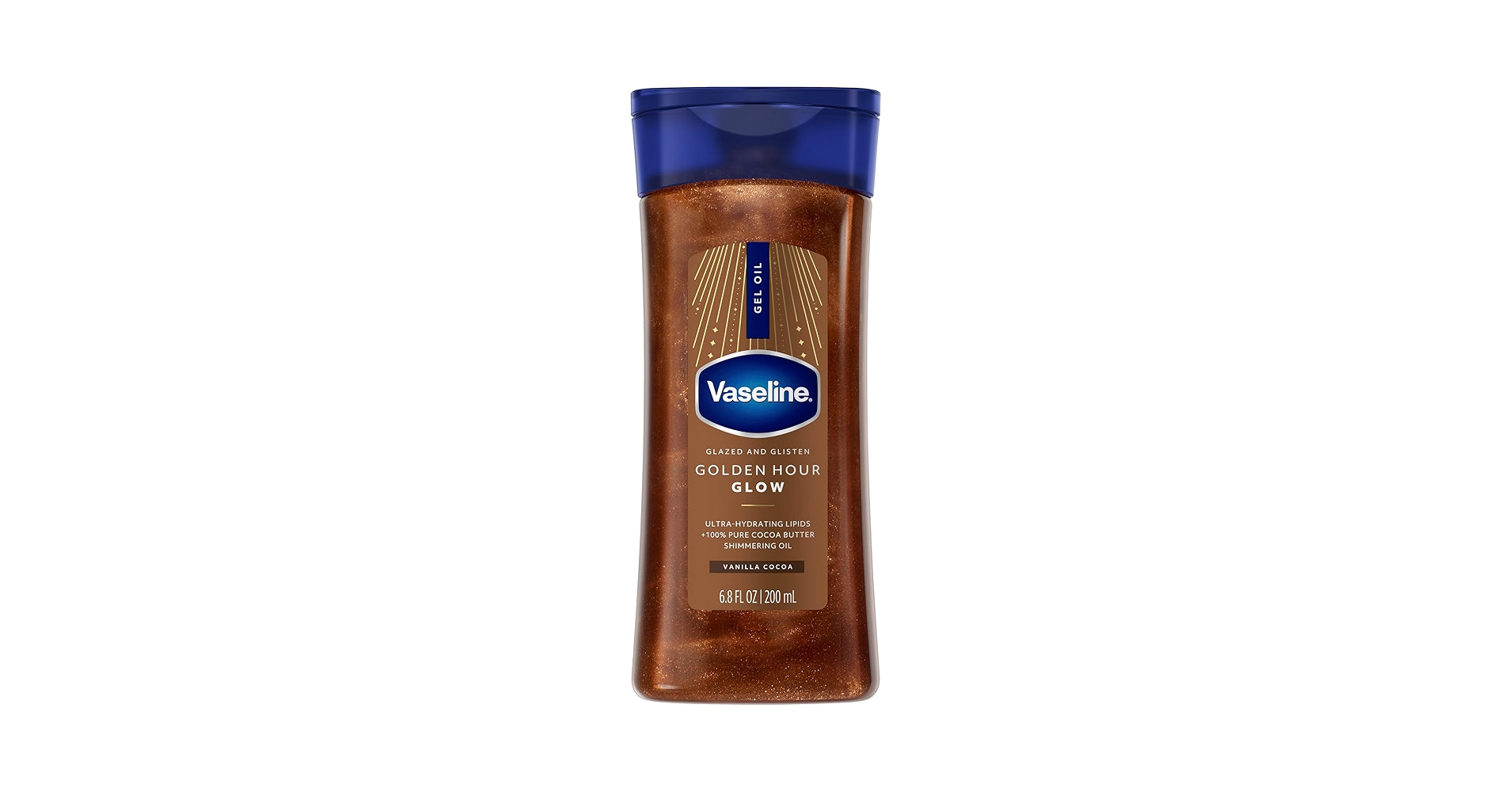 THE VASELINE GLAZED & GLISTEN GOLDEN HOUR BODY GEL OIL IS A SHIMMERING, GLOW-BOOSTING BODY OIL THAT DELIVERS A WARM GOLDEN RADIANCE WHILE DEEPLY MOISTURIZING THE SKIN. FORMULATED WITH ULTRA-HYDRATING LIPIDS AND 100% PURE COCOA BUTTER, IT LEAVES SKIN SMOOTH, GLOWING, AND BEAUTIFULLY SCENTED WITH VANILLA COCOA.