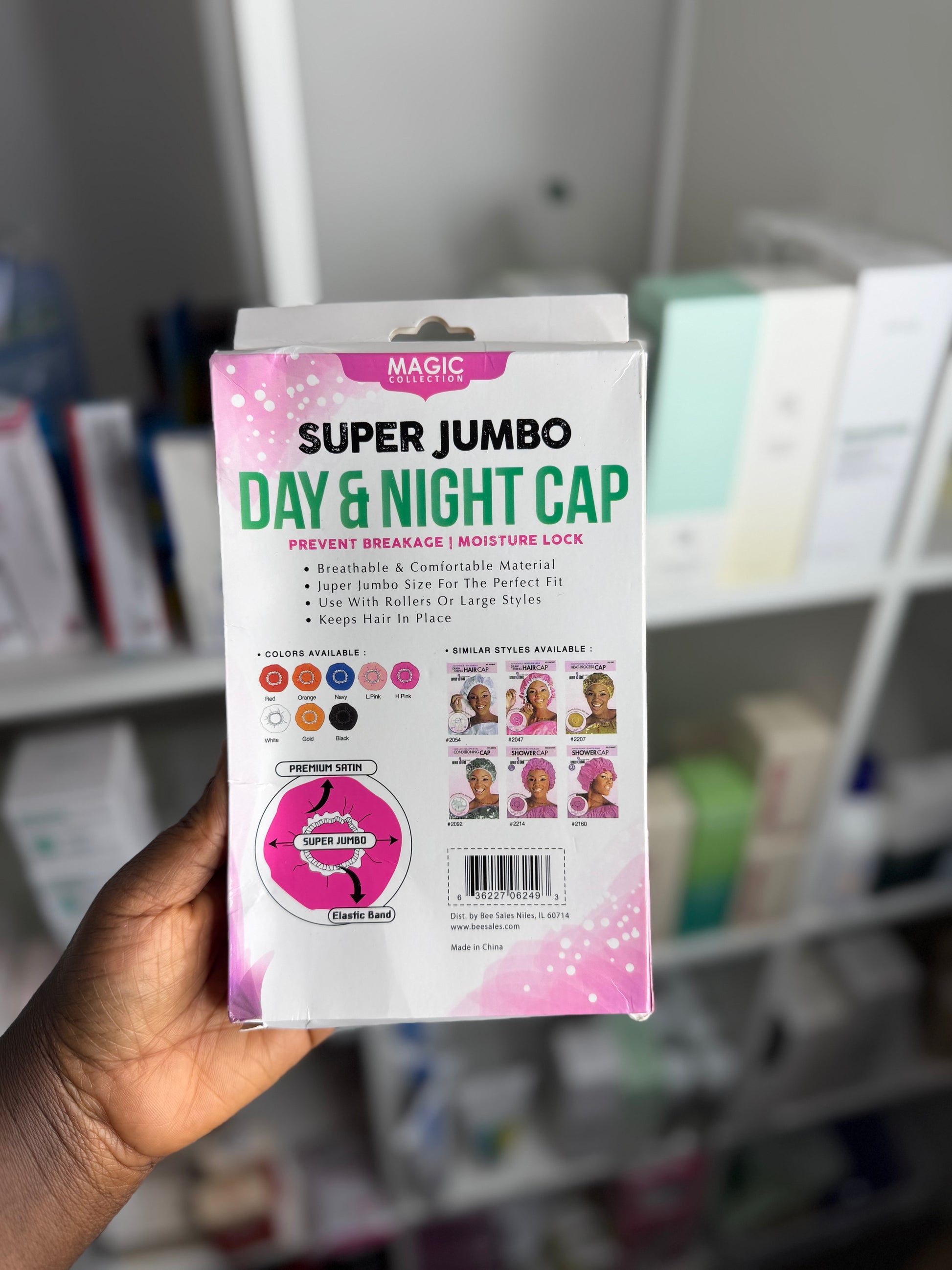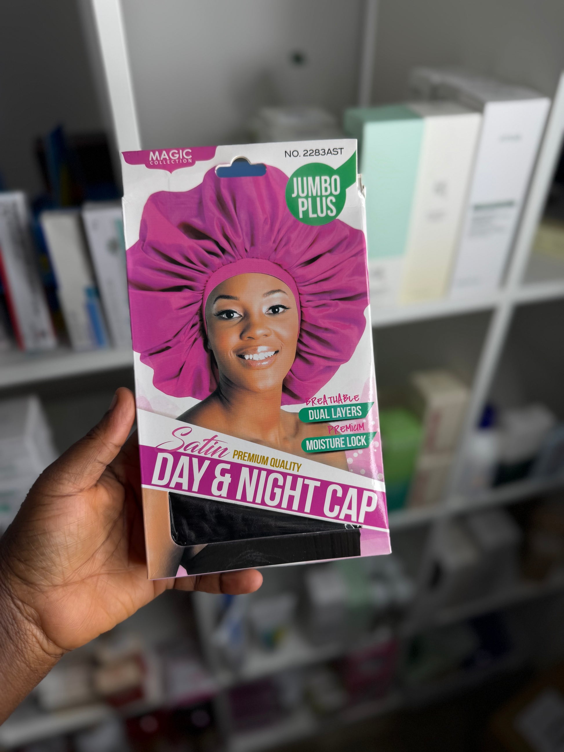 KEEP YOUR HAIR PROTECTED DAY AND NIGHT WITH THE MAGIC COLLECTION SATIN DAY & NIGHT CAP. THIS JUMBO PLUS SIZE CAP IS DESIGNED WITH PREMIUM SATIN FABRIC AND DUAL-LAYER PROTECTION TO HELP LOCK IN MOISTURE, REDUCE BREAKAGE, AND MAINTAIN YOUR STYLE.