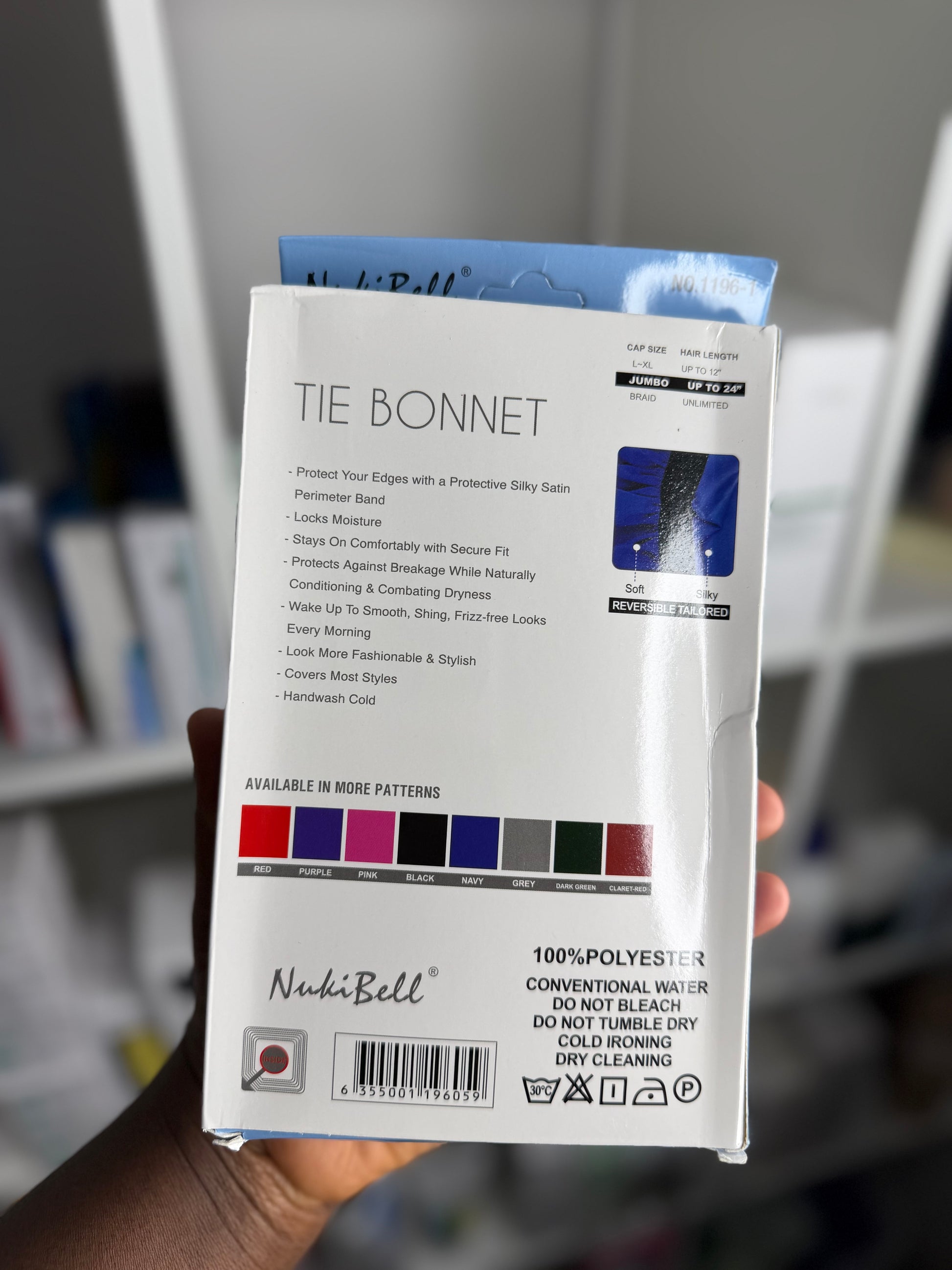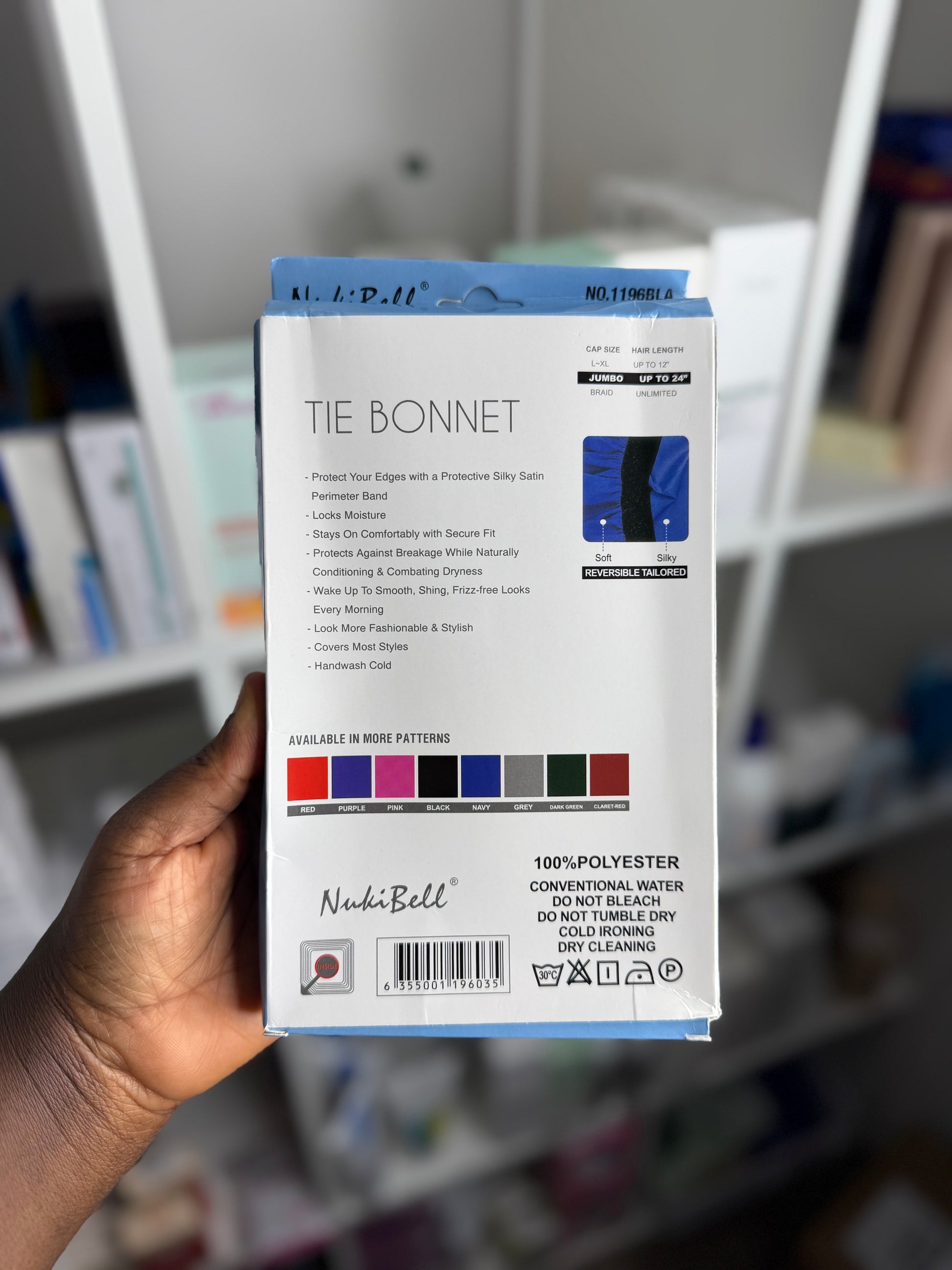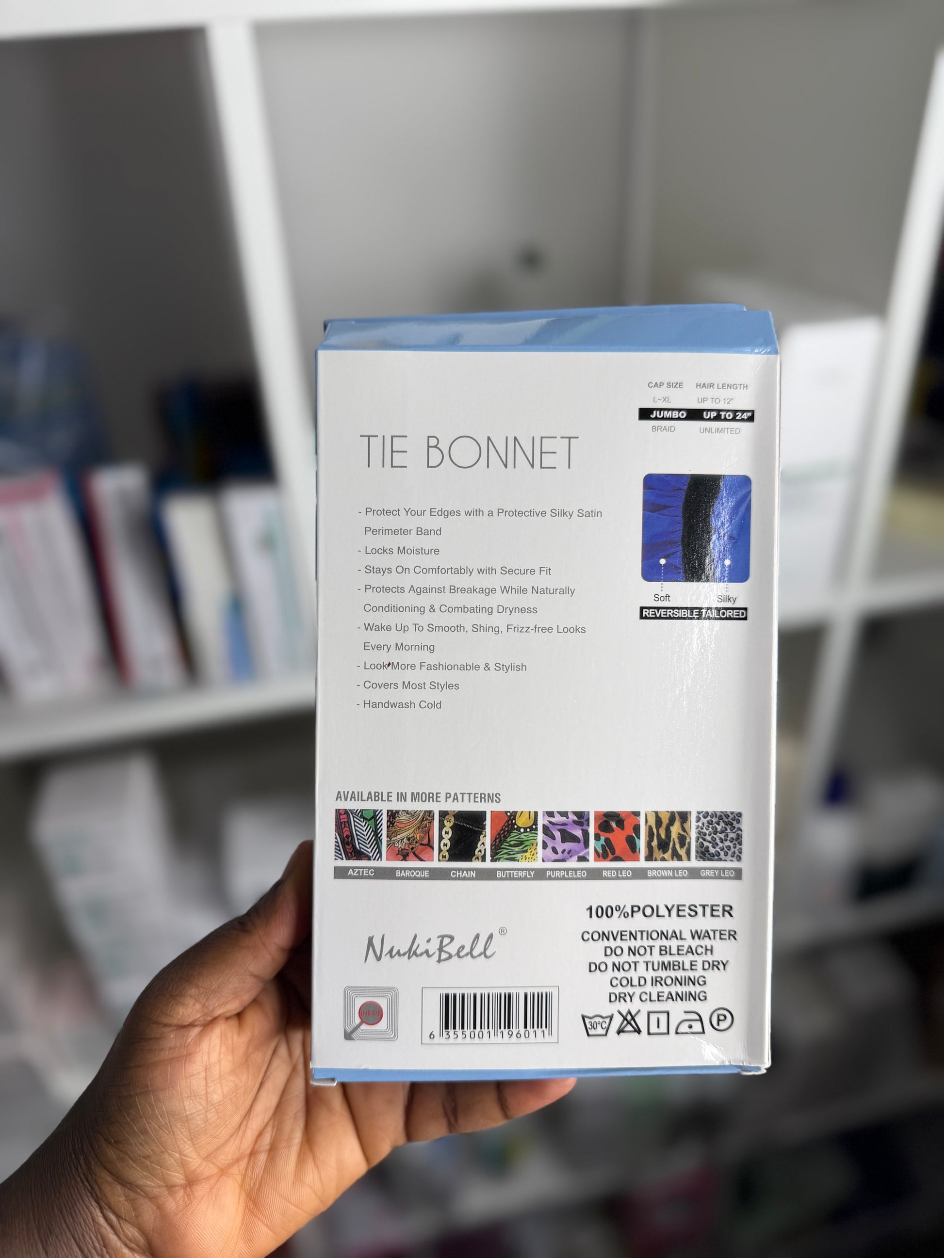 KEEP YOUR HAIR PROTECTED AND STYLISH WITH THE NUKIBELL JUMBO PLUS TIE BONNET. THIS BONNET FEATURES A REVERSIBLE DESIGN, EXCLUSIVE PATTERN, AND AN EXTRA-LONG TIE FOR A SECURE AND CUSTOM FIT. PERFECT FOR PROTECTIVE STYLES, BRAIDS, LOCS, WIGS, AND NATURAL HAIR.