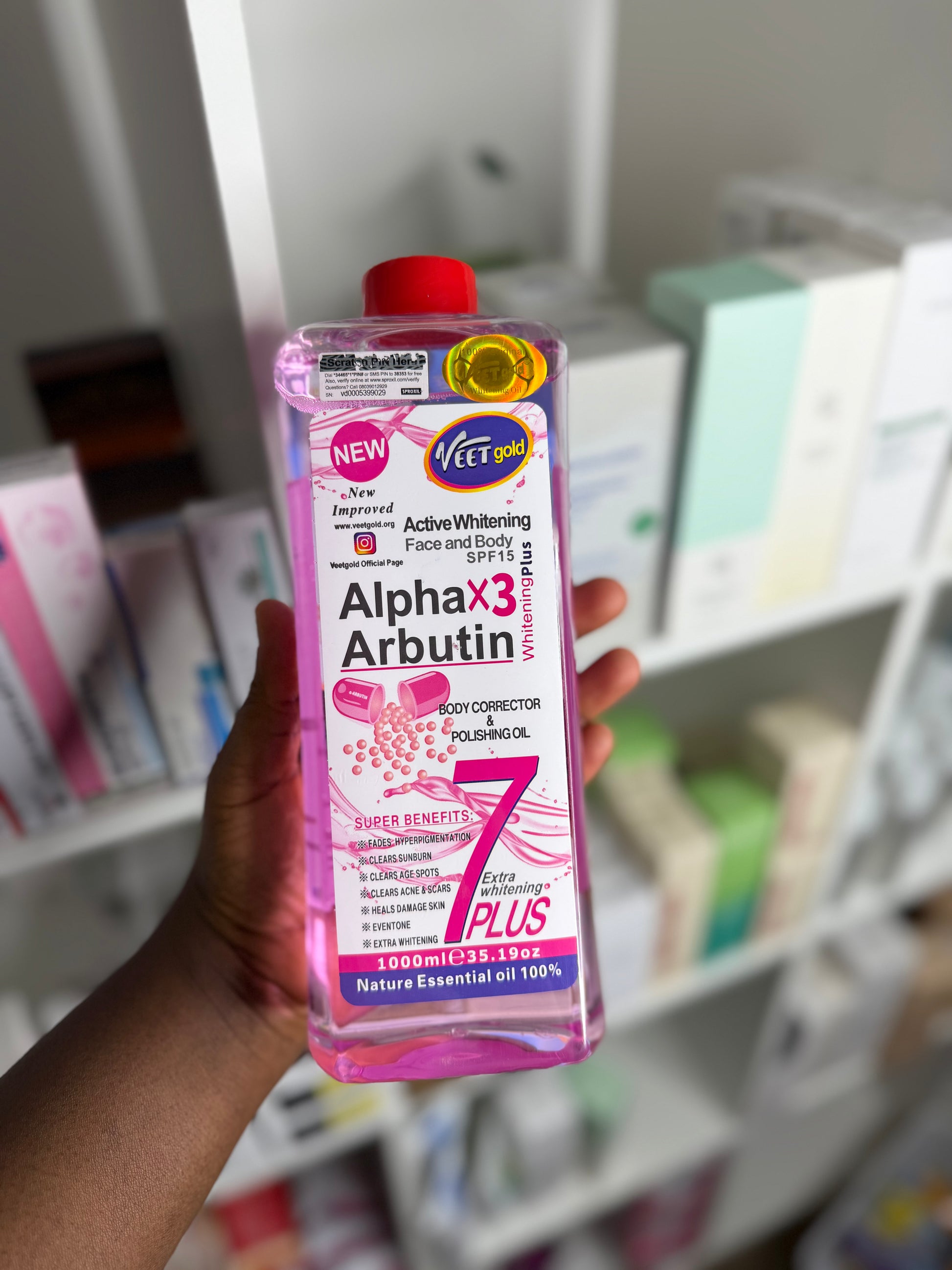 THE VEETGOLD ALPHA ARBUTIN ACTIVE WHITENING FACE & BODY OIL SPF15 IS A FAST-ABSORBING, RADIANCE-BOOSTING OIL FORMULATED TO BRIGHTEN DARK SPOTS, EVEN SKINTONE, AND DEEPLY MOISTURIZE WHILE PROVIDING LIGHT SUN PROTECTION. PERFECT FOR DAILY USE ON BOTH FACE AND BODY.